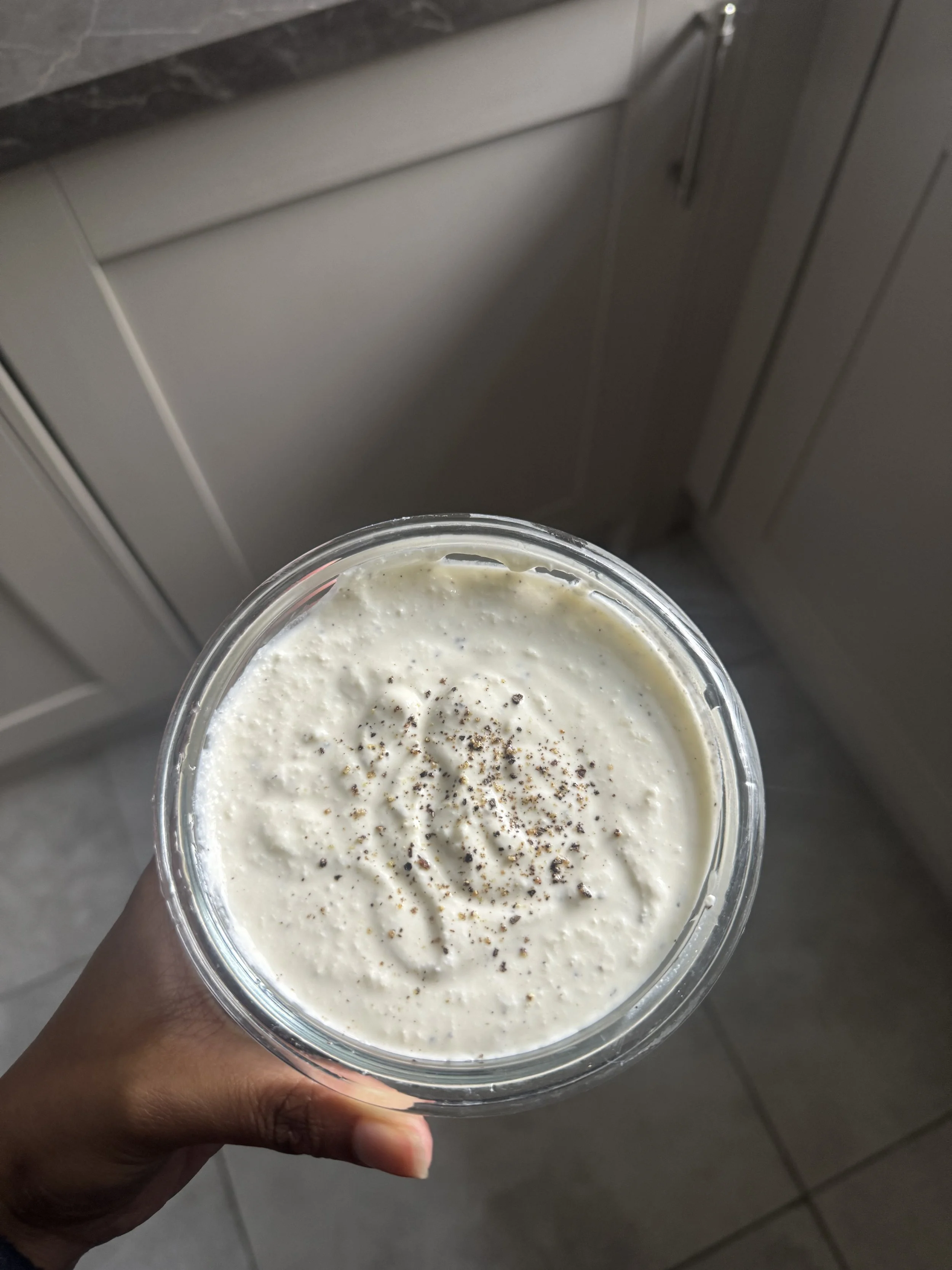 Combine or blend together* 160g full fat cottage cheese*, 2 cloves of grated garlic, 2 Tbsp water and salt + ground pepper to taste.