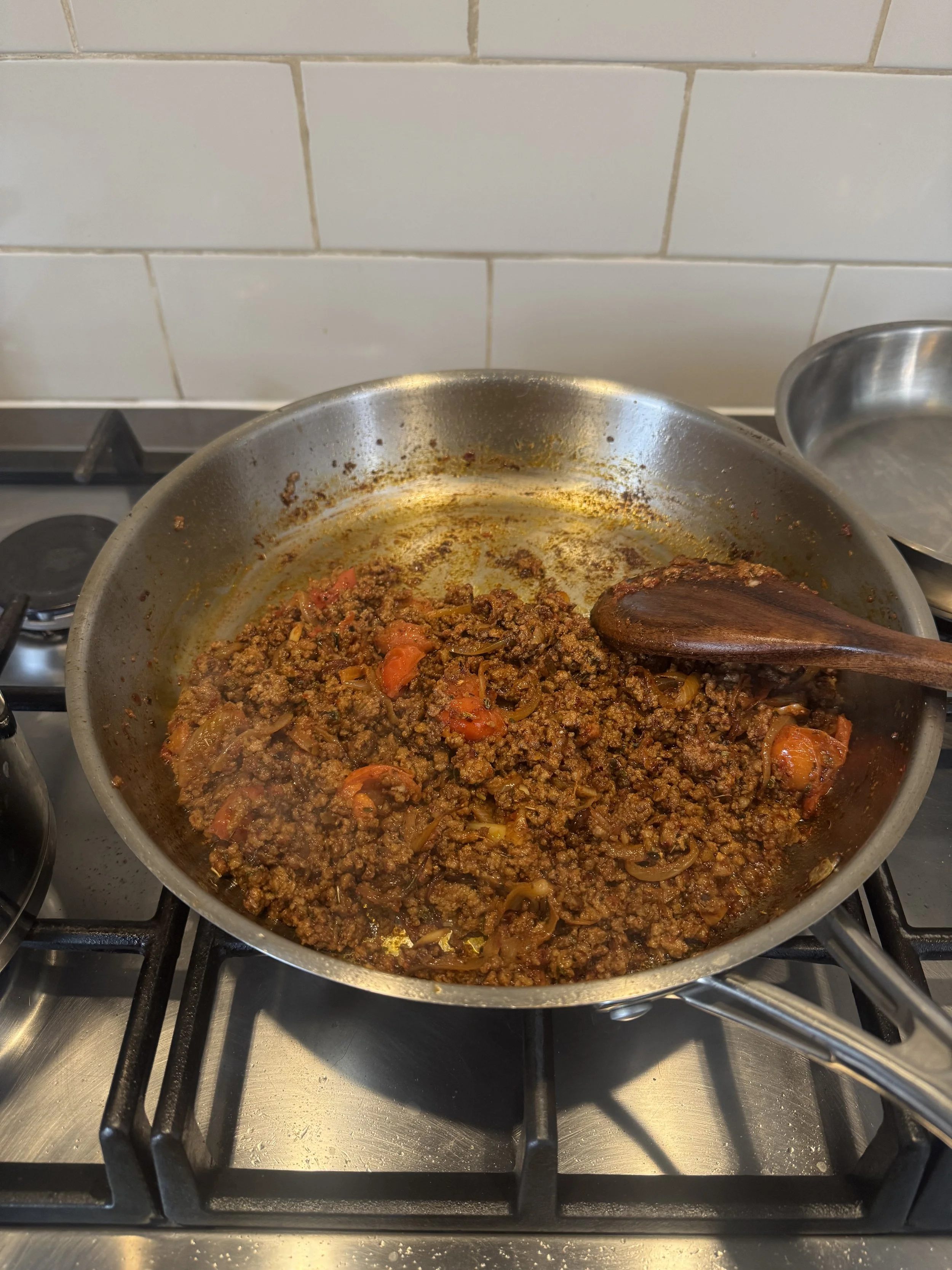 Add 1 1/2 Tbsp Turkish red pepper paste, 1 Tsp Turkish pepper flakes, 1 Tsp chilli powder, 1 Tsp paprika, 1 Tsp cayenne pepper + 2 Tsp dried mint. Cook on medium-low heat till the mince has browned - stir often to avoid burning. Salt + Pepper to taste.